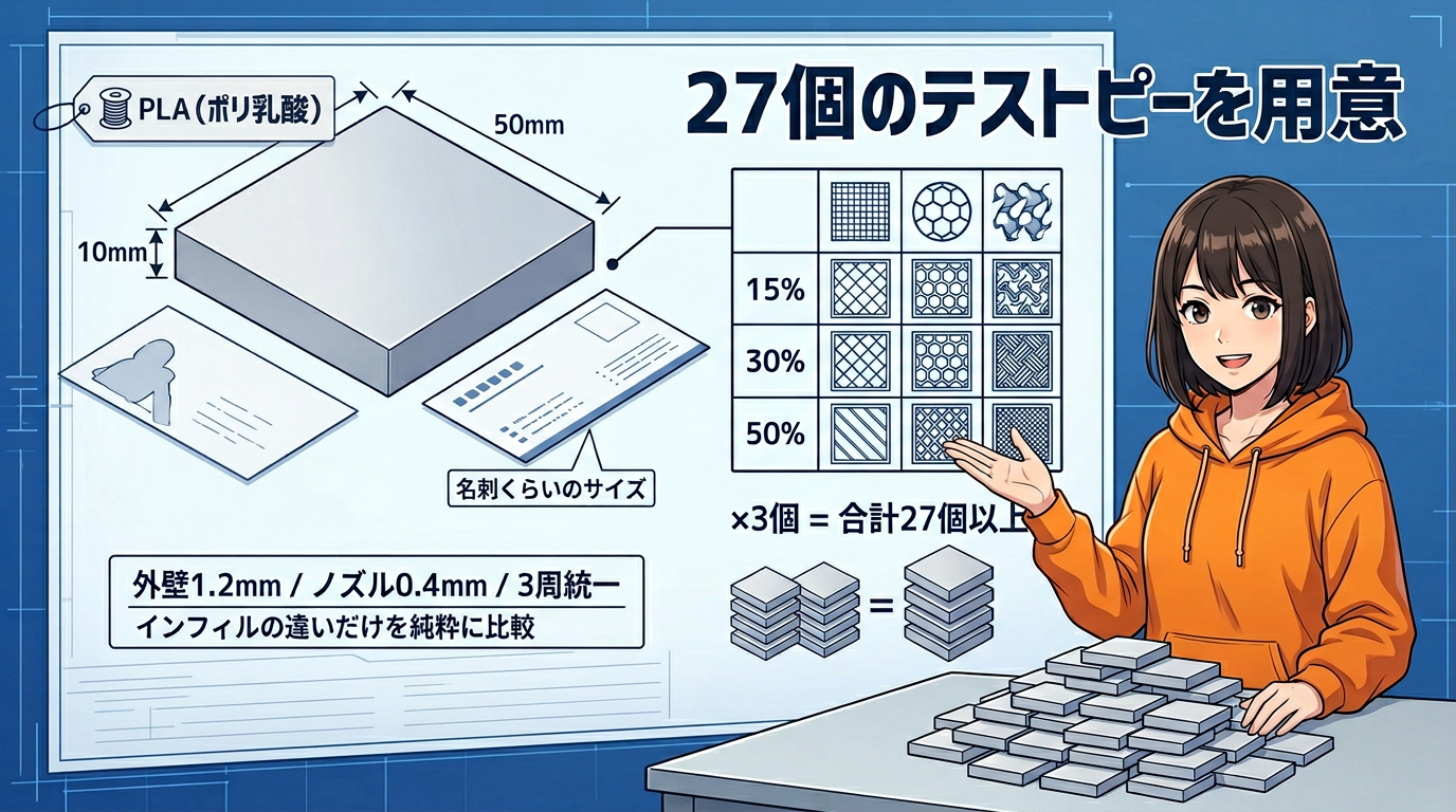 つまり、3パターン×3密度で9種類。各条件3個ずつ印刷して、合計27個以上のテストピースを用意しました。