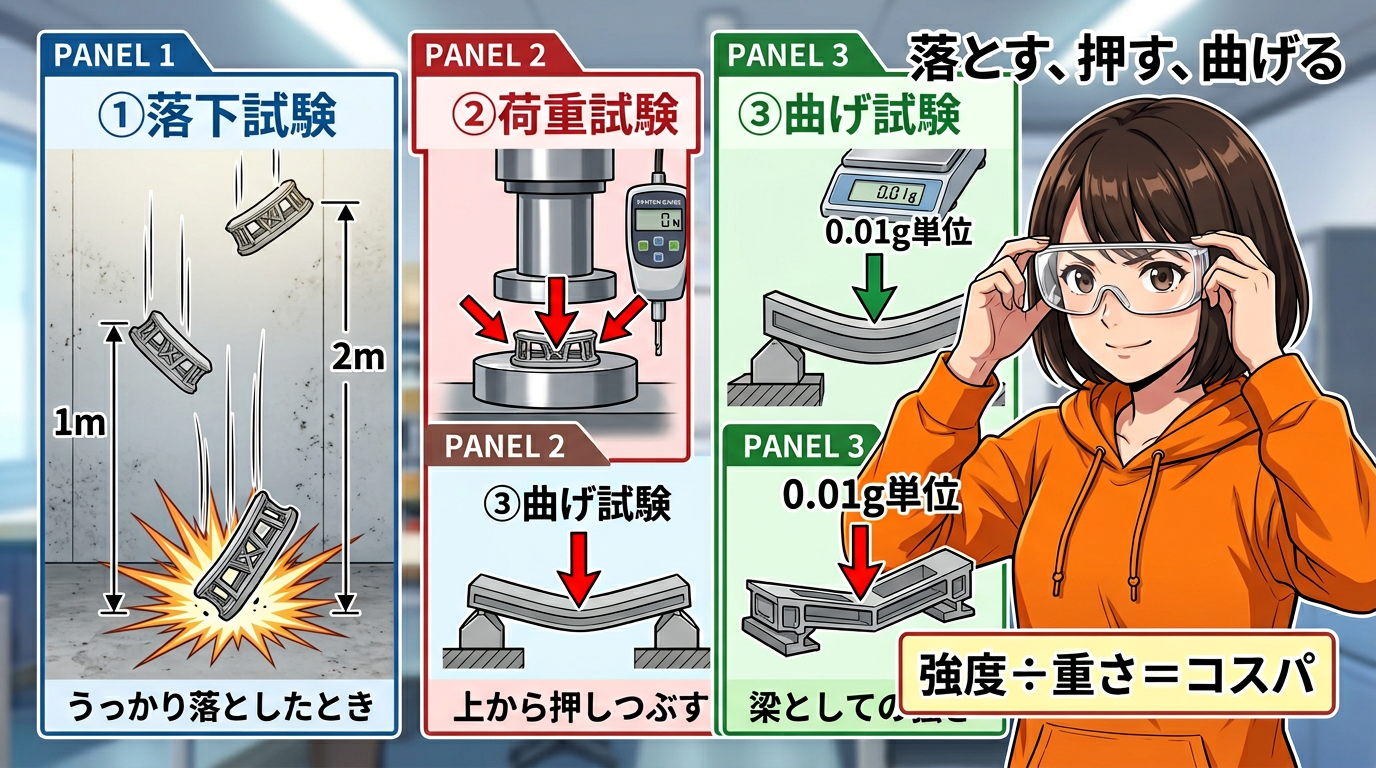 落下試験では、あるパターンが圧倒的に粘り強い結果を出しました。しかも「密度を上げれば強くなる」とは限らない、直感に反するデータも出ています。