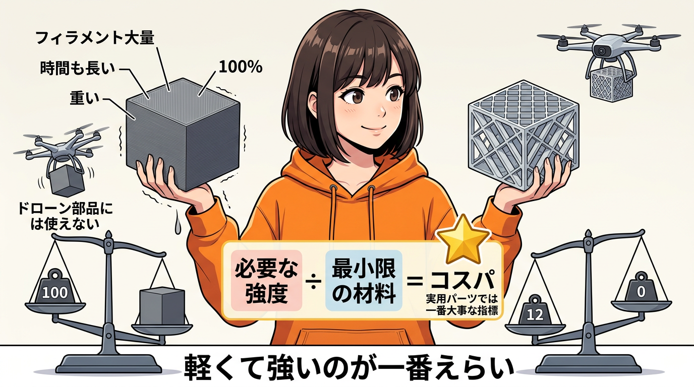 でもそれだと、フィラメントをたくさん使うし、印刷時間も長い。重くなるからドローンの部品には使えない。