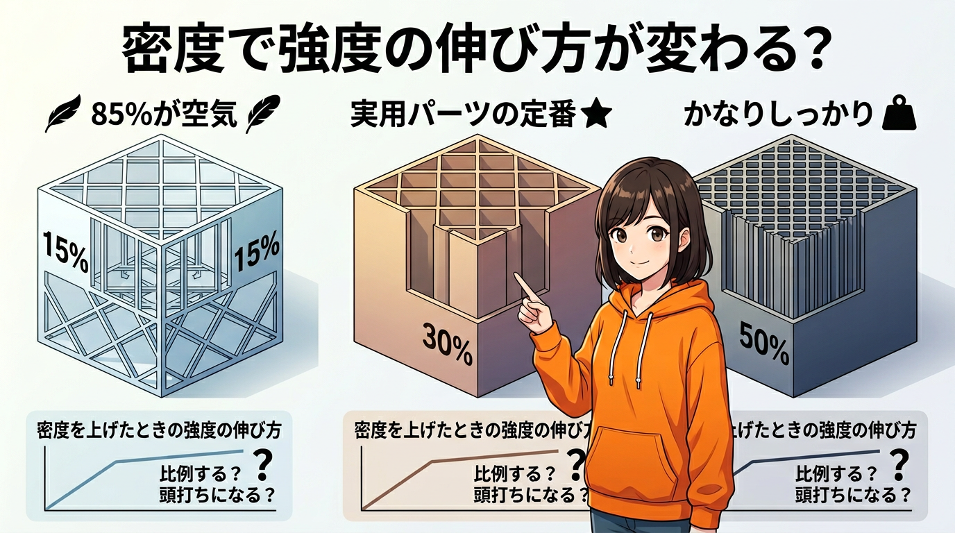 単純に「強いパーツ」を作りたいなら、インフィル100%にすればいいんです。中身をぎっしり詰めれば、そりゃ強い。