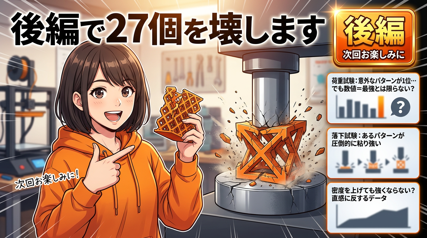 > ジャイロイド・グリッド・ハニカムの3パターンを徹底解説。それぞれの構造的な特徴、強み・弱みを理解した上で、27個のテストピースを使った破壊実験の条件を紹介します。前編では「正体」と「実験準備」を、後編で実験結果と使い分けガイドをお届けします。