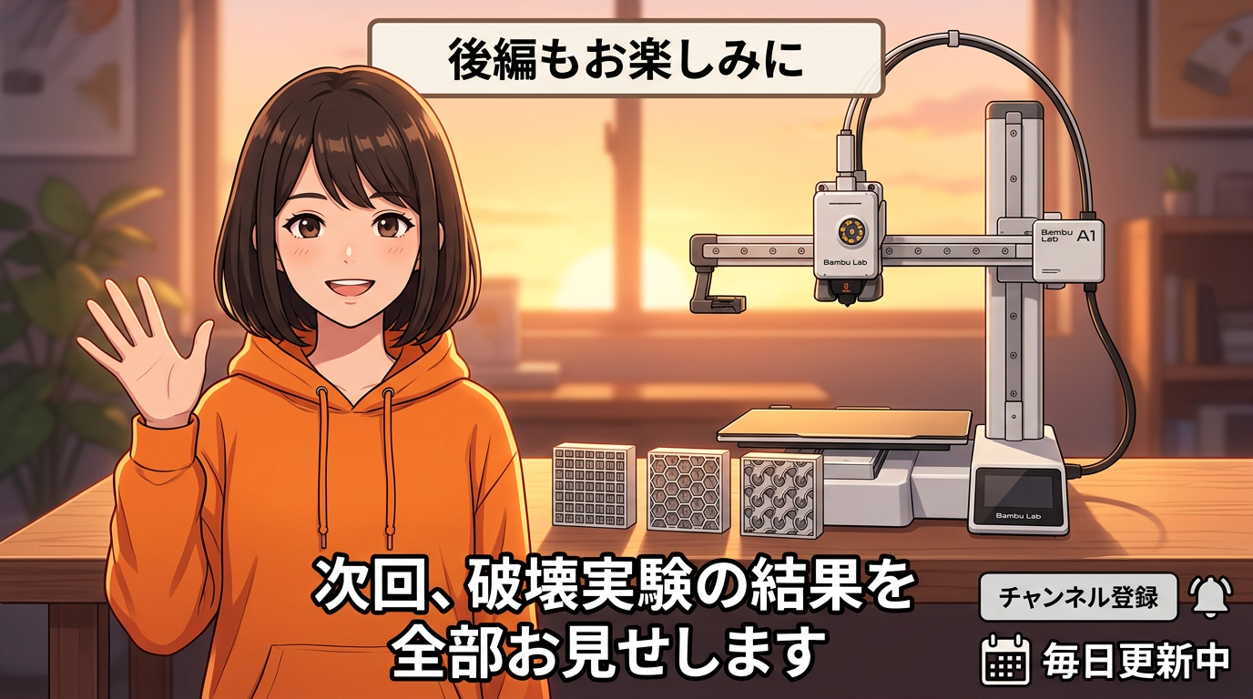 このチャンネルでは、Bambu LabのA1 miniなどの3Dプリンターを中心とした技術などを毎日更新でお伝えしてます、ではまた次回、お会いしましょう、まーでした。