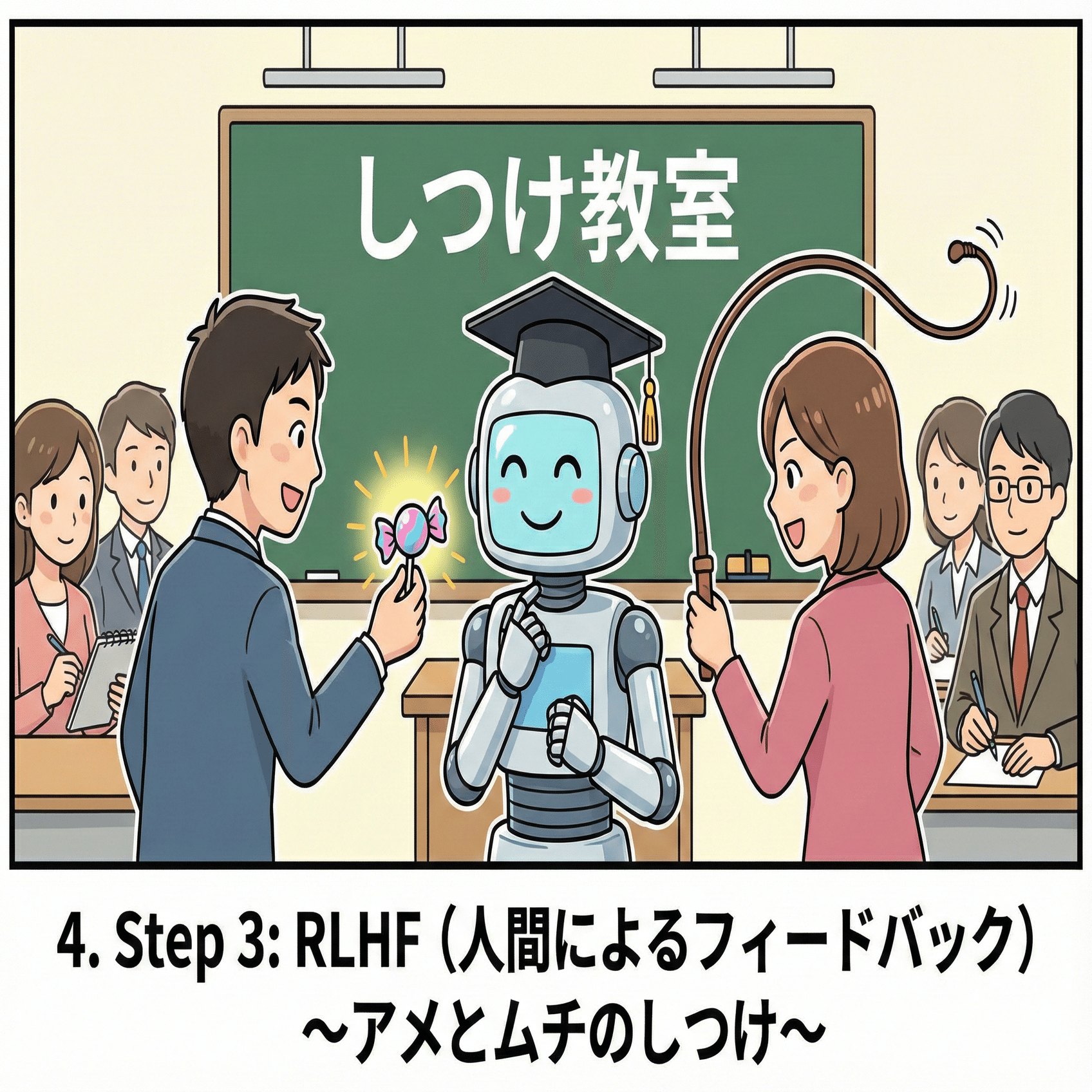4. Step 3: RLHF(人間によるフィードバック)〜アメとムチのしつけ〜 🍬