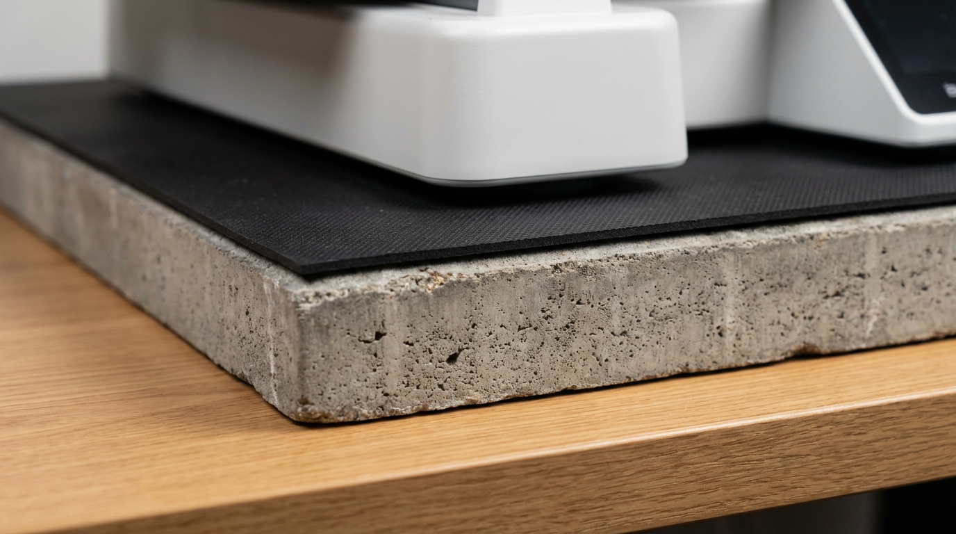 防振の基本は「重いものの上にゴムを挟む」です。コンクリートの重さが振動の伝達を減衰させて、ゴムが残りの振動を吸収する。