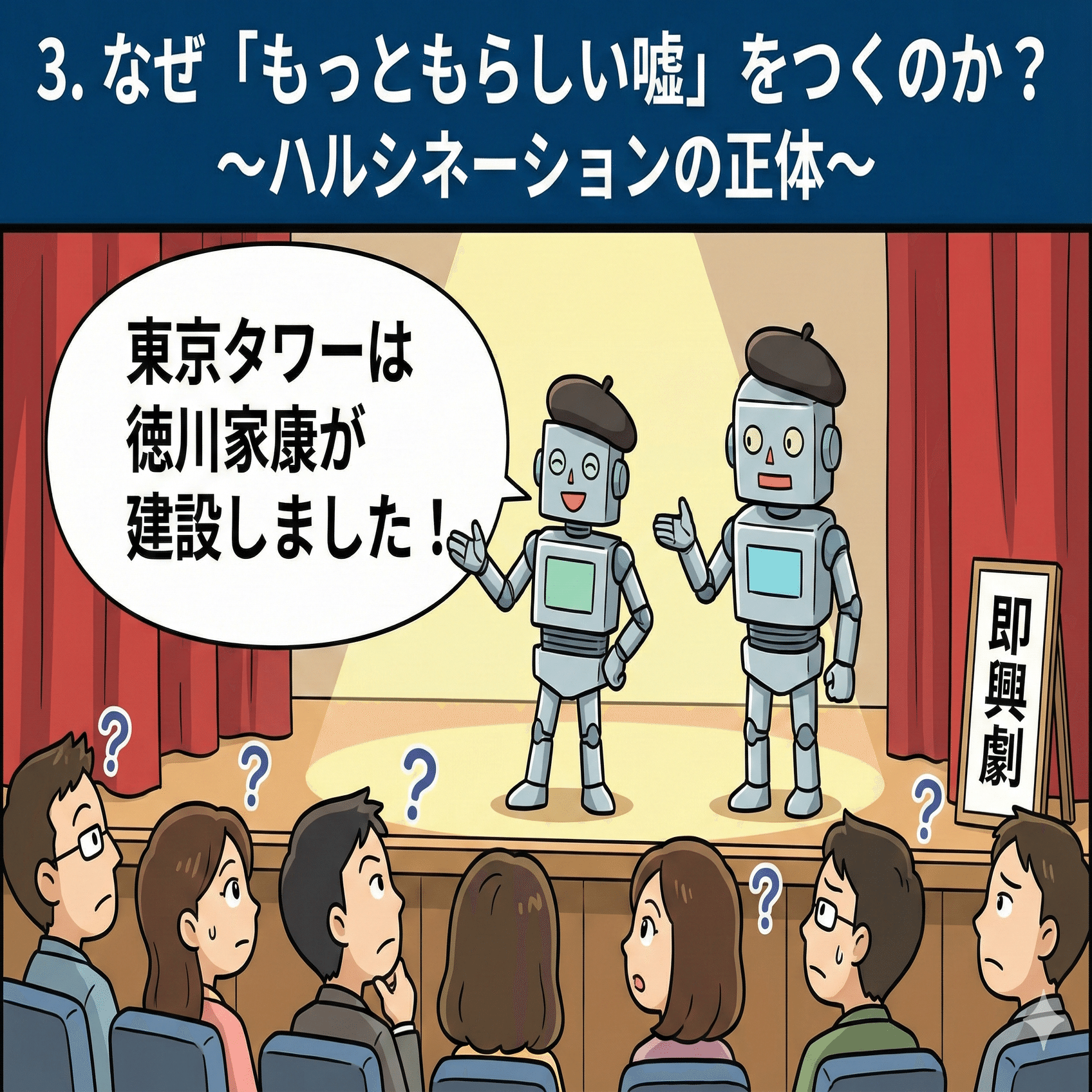 3. なぜ「もっともらしい嘘」をつくのか? 〜ハルシネーションの正体〜 🤥