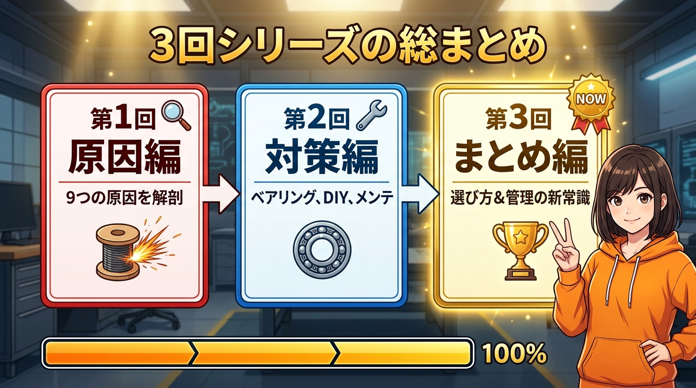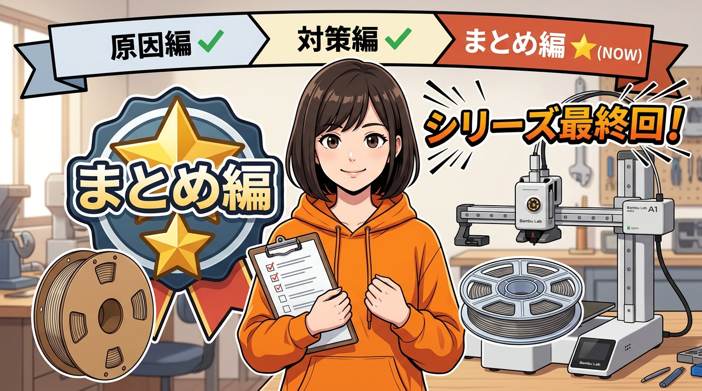 原因編では、段ボールスプールの摩擦やエクストルーダーの限界など9つの原因を解剖。対策編では、ベアリングスプールホルダーやDIY対策、診断フローチャートまでお伝えしました。