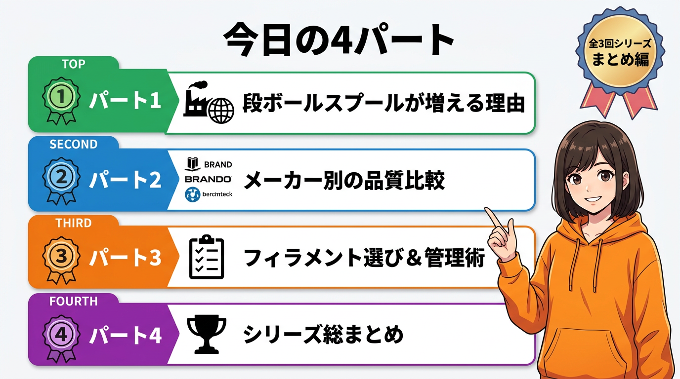 そして今回、まとめ編。段ボールスプールが増える業界トレンドの中で、メーカーごとの品質の違い、フィラメント選び・管理の新常識をお伝えしました。
