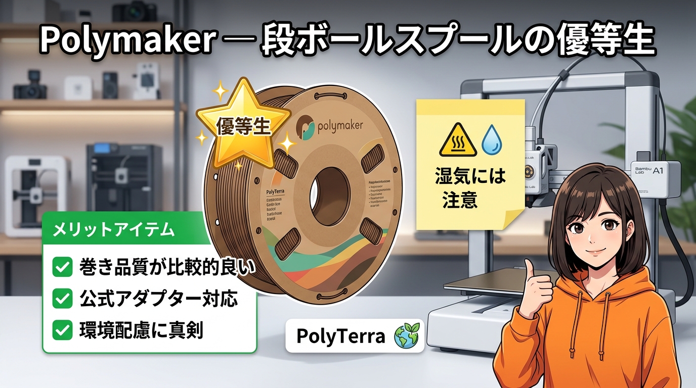 さらにPolymaker自身が専用のカードボードスプールアダプターを案内しています。Bambu系ユーザーも対応モデルを探してみる価値がありますよ。