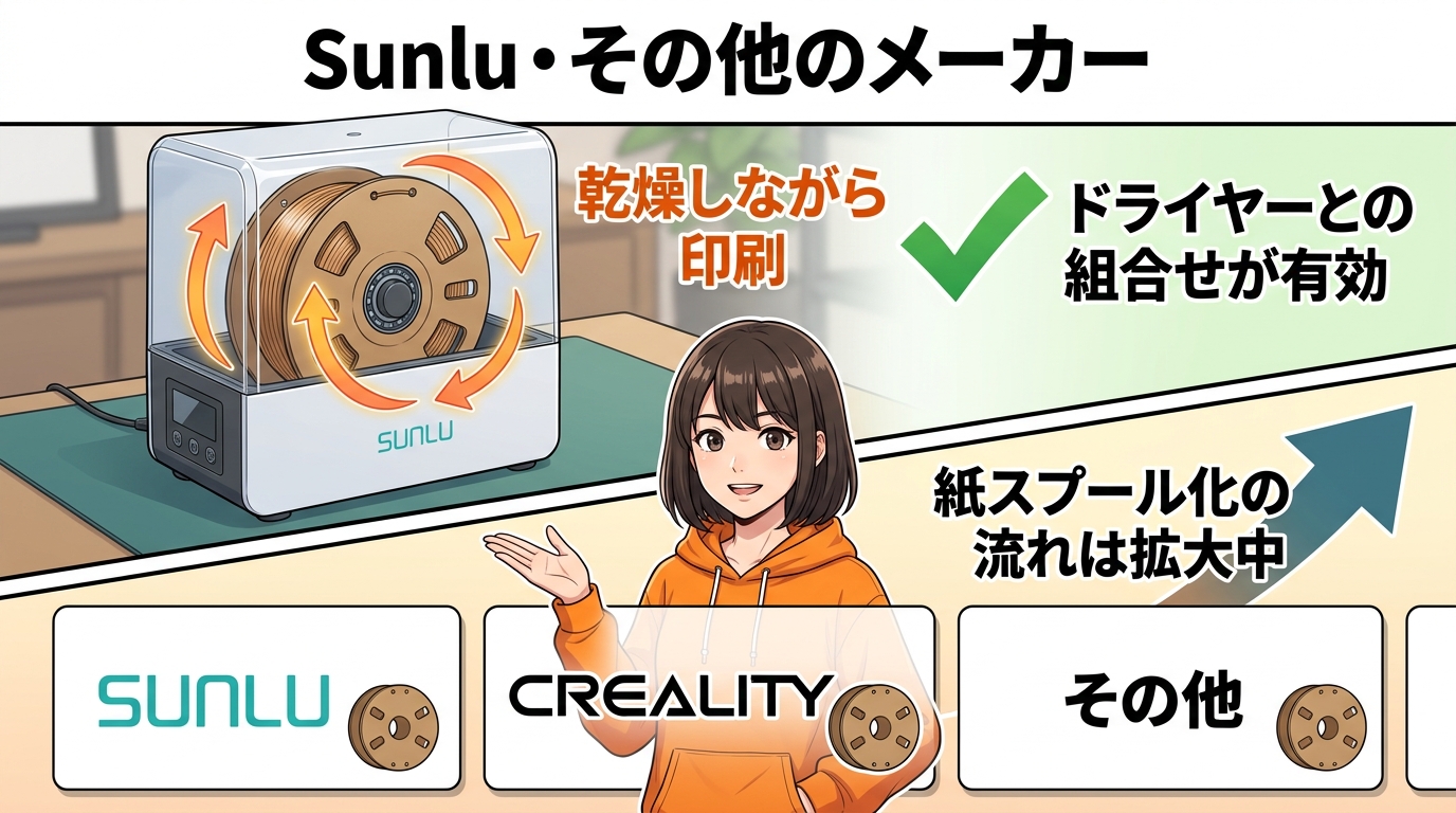 ここ数年で、フィラメントのスプールをプラスチックから段ボールや紙系素材に切り替えるメーカーが目立ってきています。PolymakerやeSUNを中心に、段ボール系スプールや紙系スプール対応を進めるメーカーが増えてきました。
