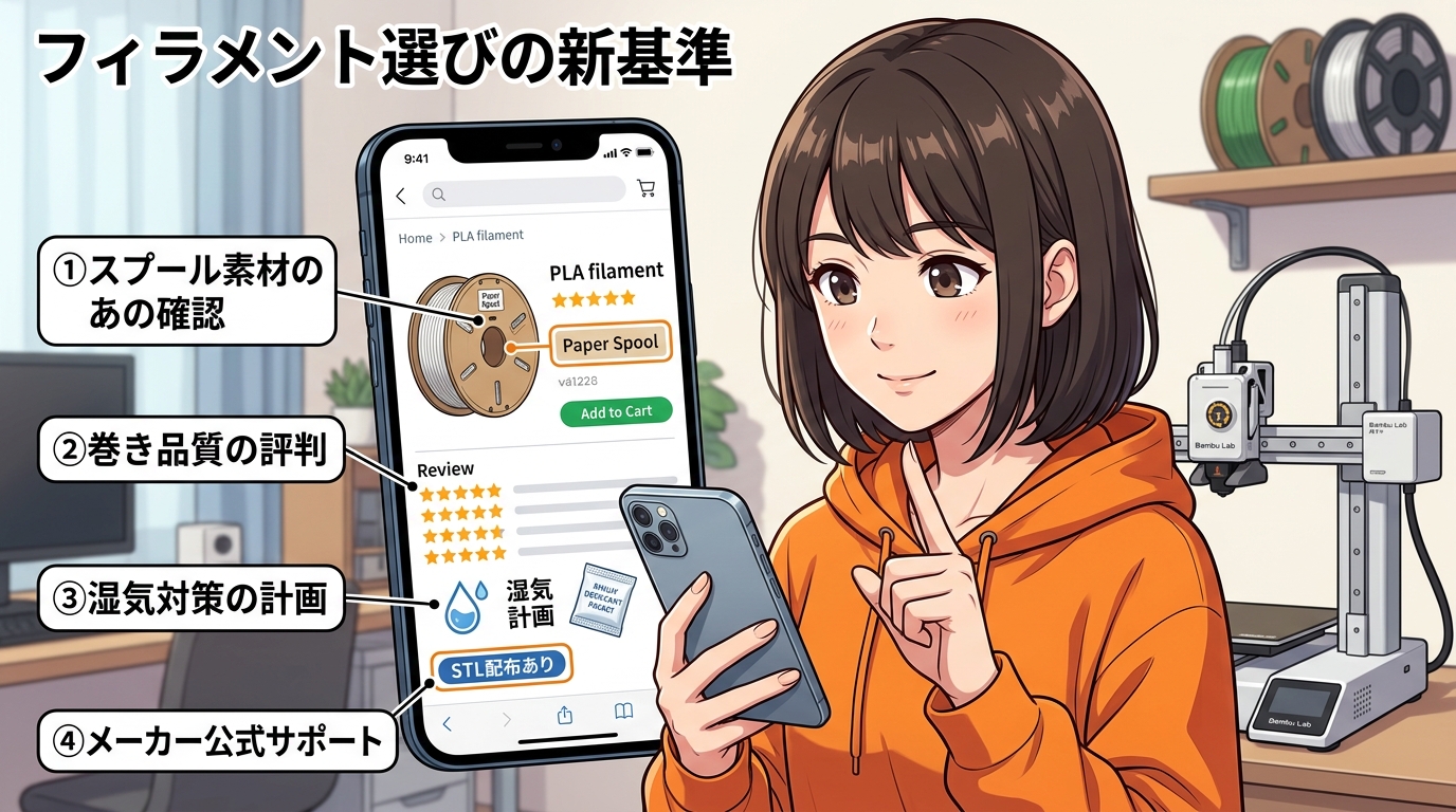 ③段ボールスプール時代のフィラメント選び&管理術。買う前にチェックすべきポイントと、買った後の保管・運用のベストプラクティス。