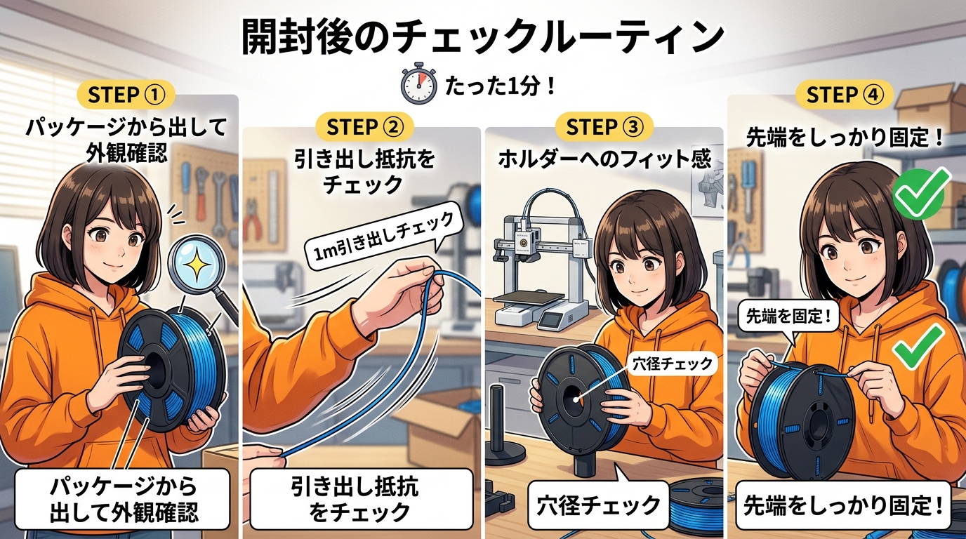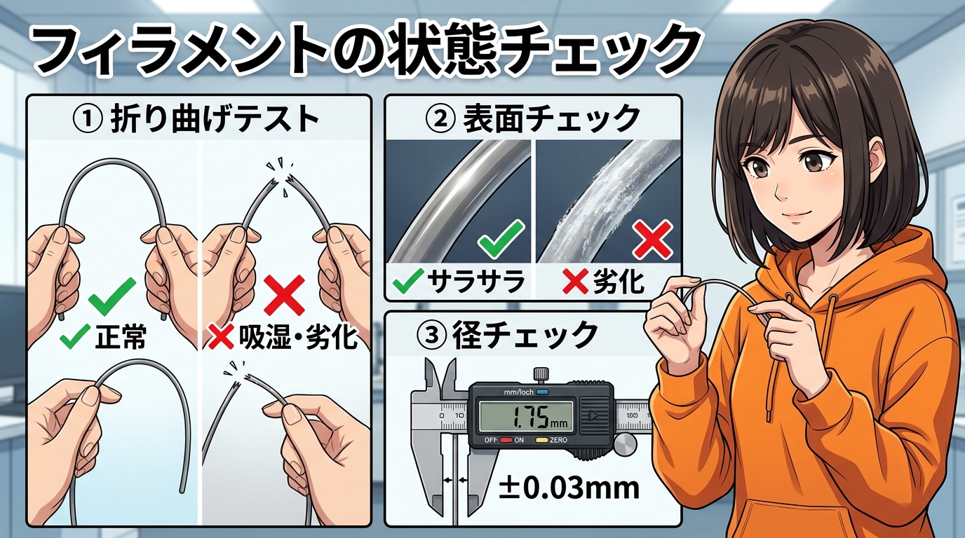 ①折り曲げテスト。フィラメントを指でU字に曲げてみてください。明らかに脆くなっていたり、以前より折れやすいと感じたら、吸湿や経年劣化を疑って乾燥を試す価値があります。