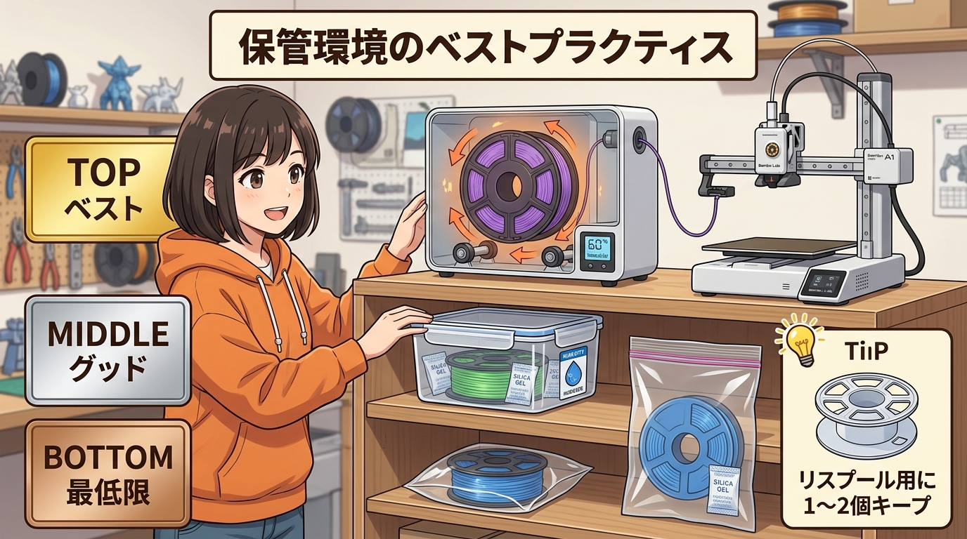 長期保管が必要な場合は、密閉容器に乾燥剤を入れて保管してください。100均の密閉コンテナとシリカゲルで十分です。理想を言えばフィラメントドライヤー兼用のドライボックスがあるとベストですが、コスト的に無理なら密閉容器で大丈夫。