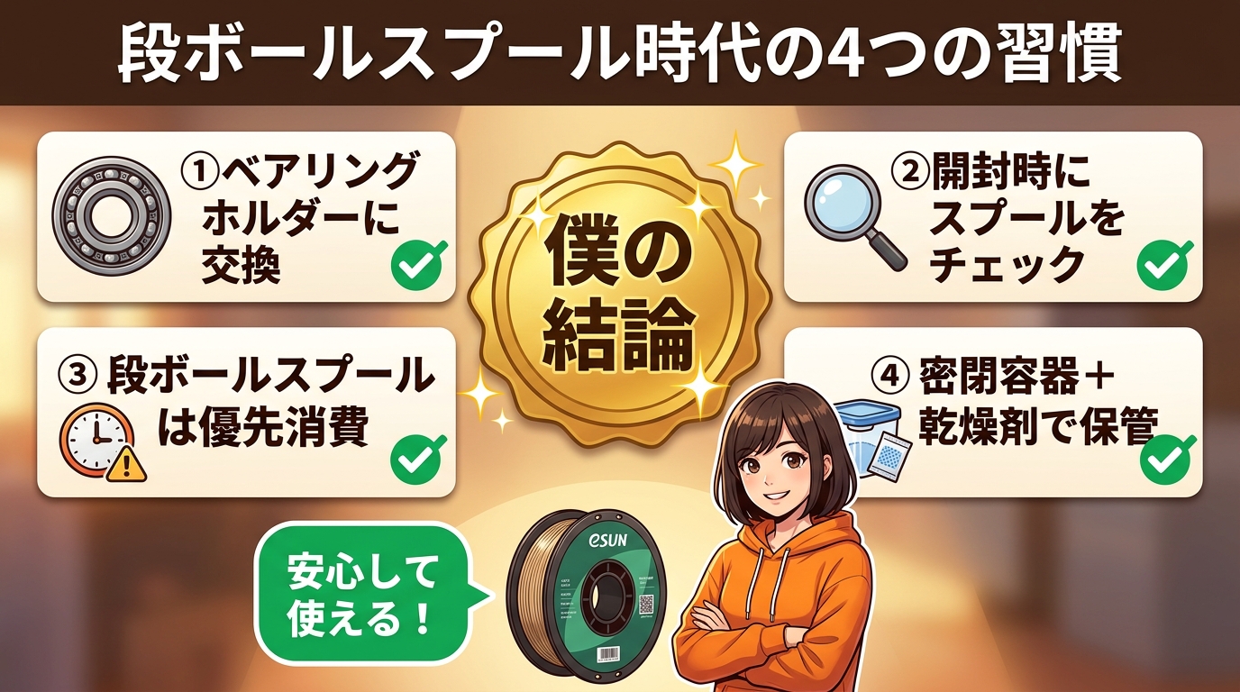 ここまでの話を踏まえて、段ボールスプール時代のフィラメント運用について僕なりの結論をお話しします。