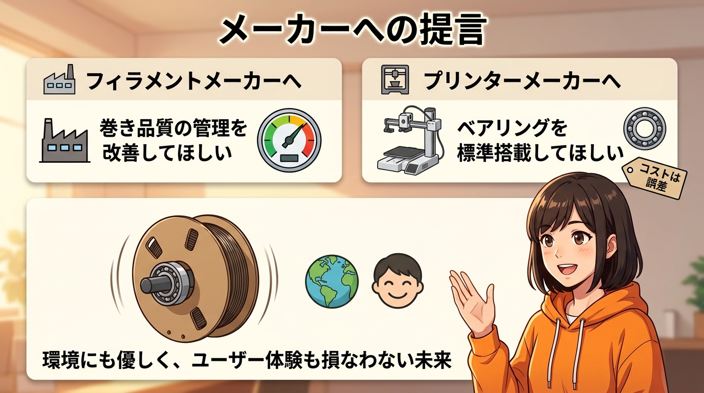 逆に言うと、この対策さえしておけば、eSUNの段ボールスプールでも全く問題なく使えるんです。コスパの良いフィラメントを安心して使えるようになる。それが今回のシリーズで一番伝えたかったことです。