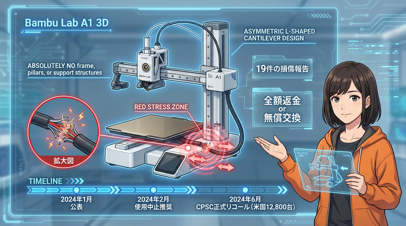 Bambu Labは2024年2月の時点で、市場に出ていたA1全体に対して使用中止を強く推奨する自主対応を行いました。さらに米国では、消費者製品安全委員会(CPSC)が2024年6月に正式リコールを公表。米国内の約12,800台を対象に、19件のケーブル損傷報告(うち1件は火花が散る事象を含む)を受けて、全額返金または対策済みヒートベッドへの無償交換が実施されました。