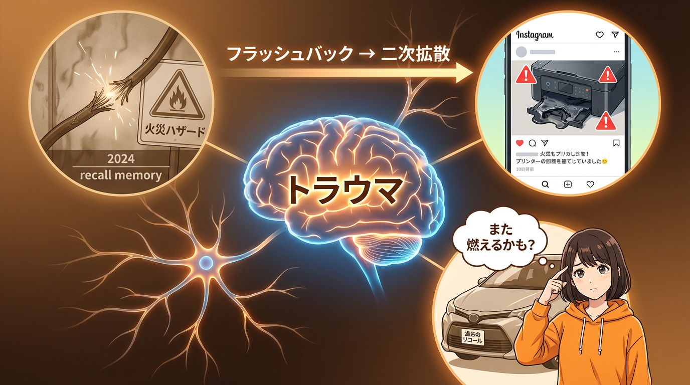 車で例えると、過去にリコールを経験した車種のオーナーが、「またエンジンから異音がする」という別の不具合を「また燃えるかも」と連想してしまう、あの心理と同じですね。