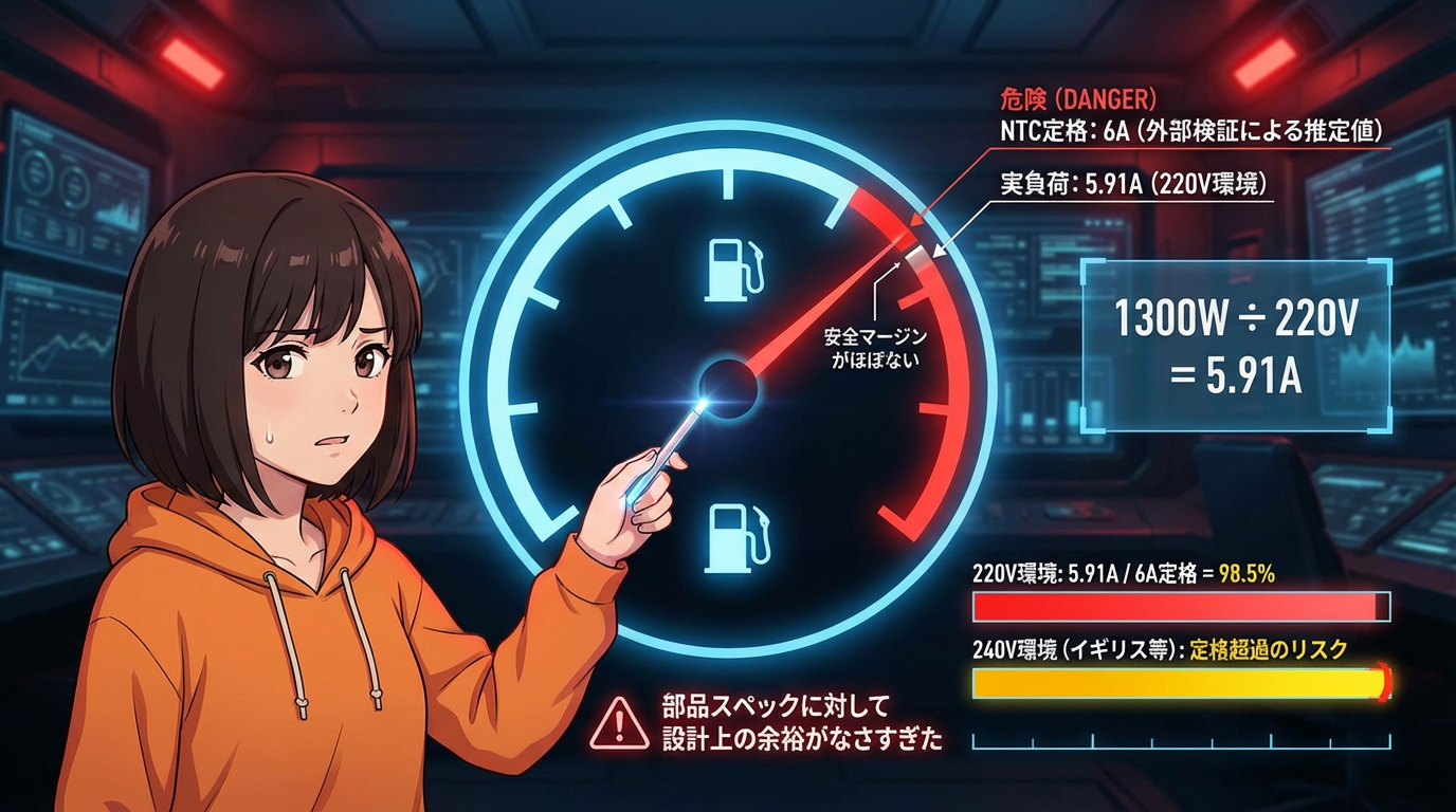 先ほど、220V環境では1300Wの電力が流れて、外部検証の指摘通りなら定格ギリギリになる可能性があるとお話ししましたよね。