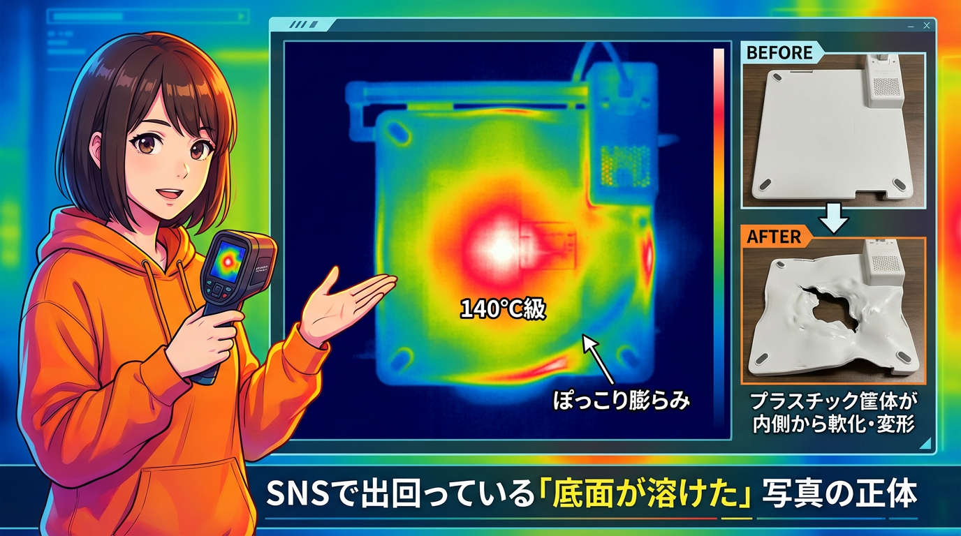 いずれにしても、基板のすぐ近くにある本体底面のプラスチック筐体が、内側からの熱で軟化・変形する事例は複数確認されています。「底面がぽっこりと膨らむ」「溶けて穴が空く」といった物理的な変形の報告がそれです。
