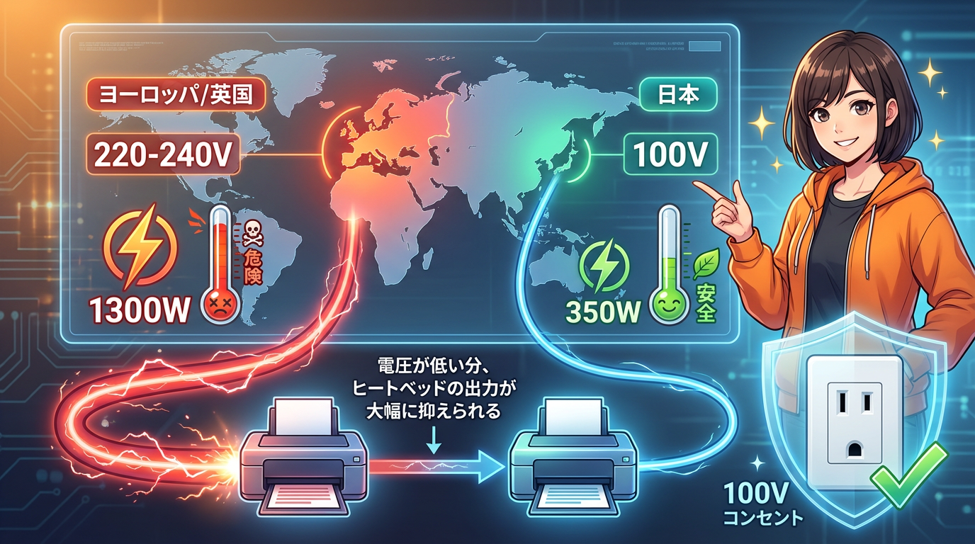 A1のシステムは、110V環境下では最大消費電力を約350Wに制限するように設計されています。これは電圧が低い分、ヒートベッドの出力が大幅に抑えられるためです。
