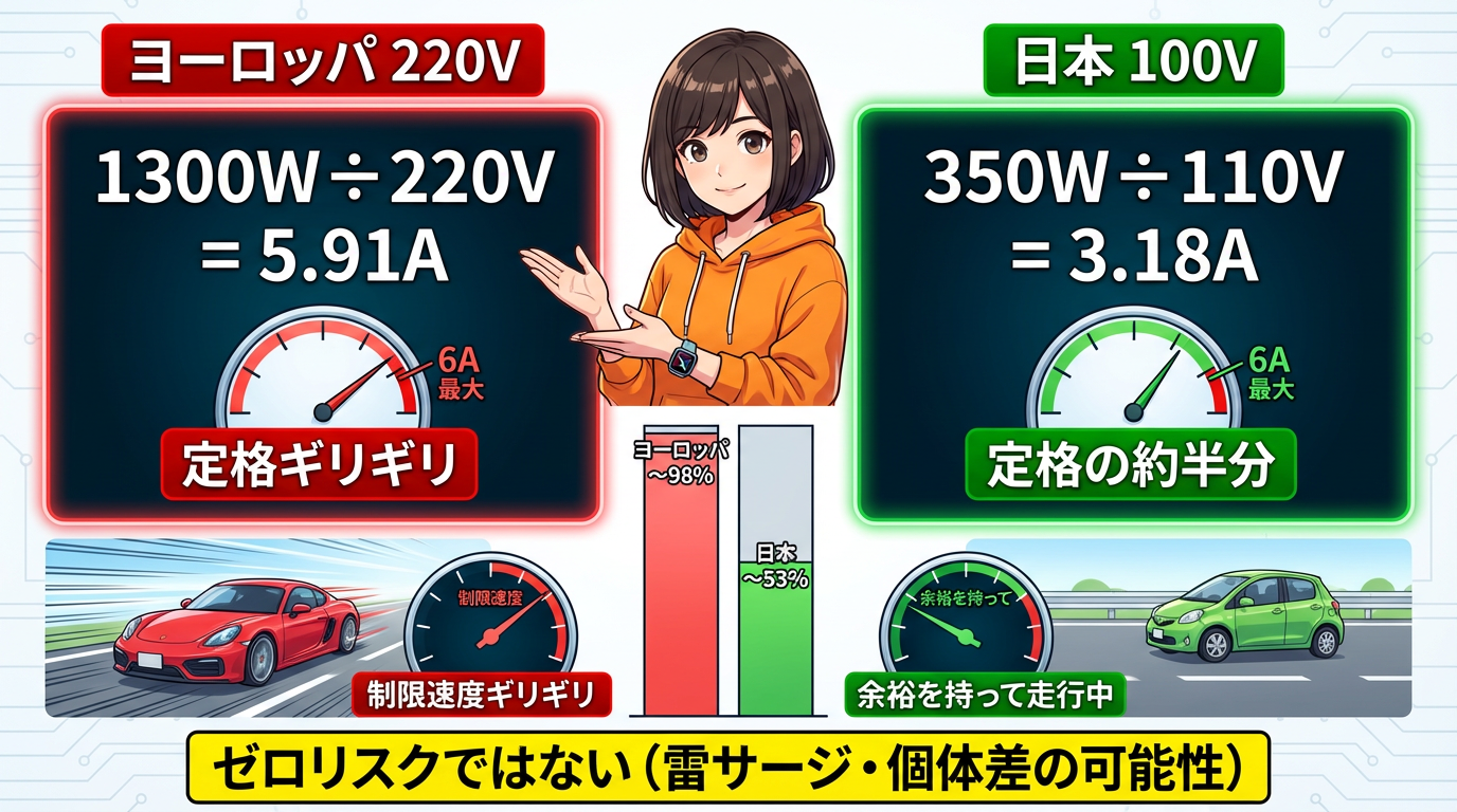 車で例えると、ヨーロッパ環境は制限速度ギリギリで走っているようなもの。一方、日本の環境は同じ道をかなり余裕を持って走っている状態。仕様上の最大電力が低い分、220V圏よりは厳しくない条件と考えられます。