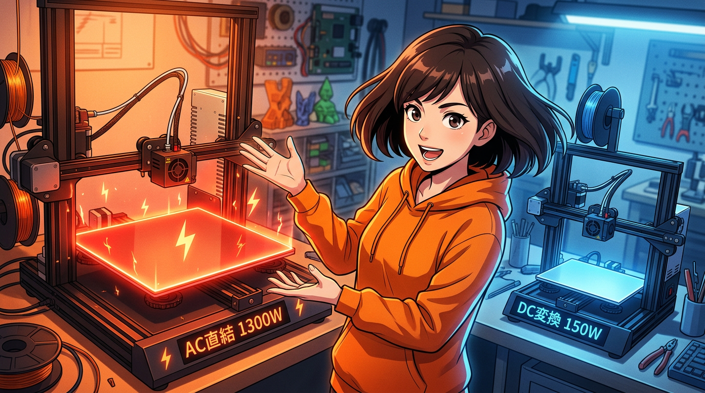 A1は、大型のビルドプレートを高速に加熱するために、交流電源をそのまま直接使う「AC直結ヒーター」を採用しています。キッチンのグリドル(鉄板)と同じ原理ですね。家庭用コンセントの100Vや220Vの交流電力をダイレクトにヒーターに流して、一気に加熱します。