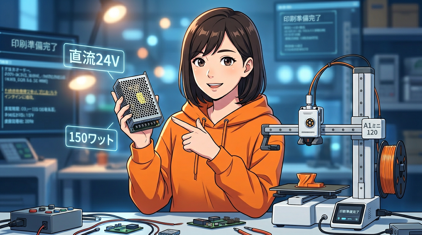 A1 miniはビルドボリュームがA1より小さく、最大電力も150W程度と、A1の220V時1300Wとは桁が違います。A1 miniの電源は24VのDC出力スイッチング電源ユニットで、Bambu Lab公式ストアでも交換パーツとして販売される汎用的な構造です。