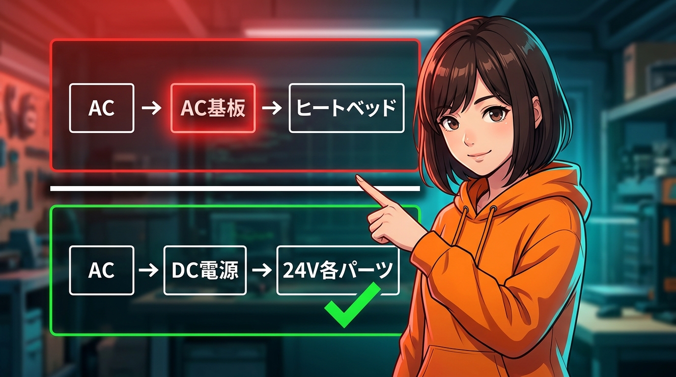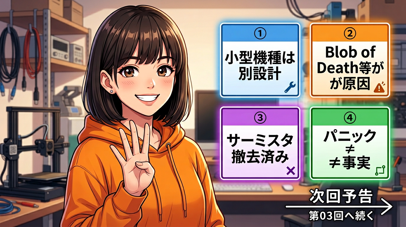 ② トラブルの混同:A1 miniのトラブル報告の一部は、ホットエンド周辺のトラブル(Blob of Death等)によるものであり、これらを今回の電源基板の問題と単純に混同するのは危険。