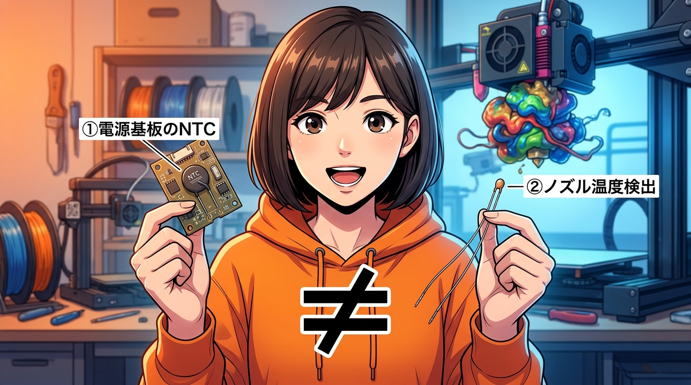 「A1のNTCサーミスタが発熱した」という事実と、「A1 miniのノズルサーミスタを物理的に壊してしまった」という別の事実が、ごちゃ混ぜになって「A1シリーズは全部燃える」という誤った結論に飛躍してしまっているのです。