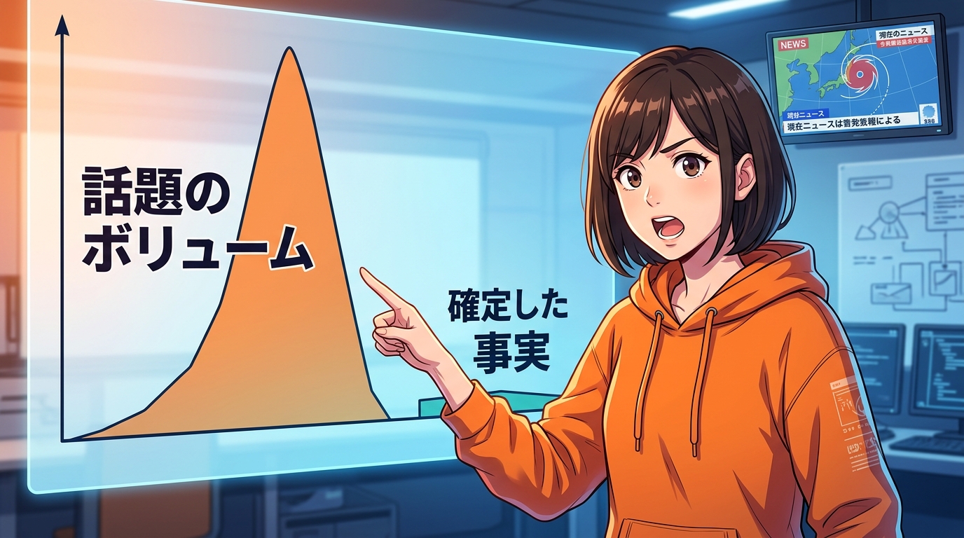 SNS上の情報を読み解く際に最も重要なのは、「話題のボリューム(声の大きさ)」と「確定した事実の量」は比例しないということです。