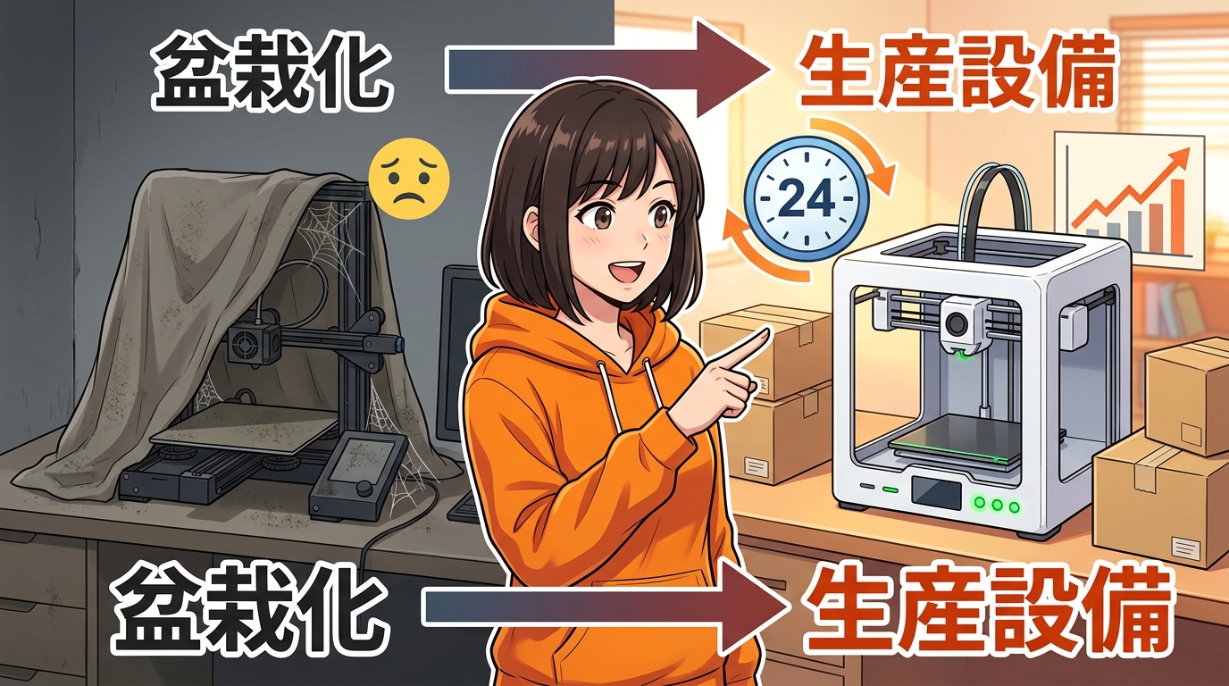 セットアップに3日かかるとか、毎回ベッドの水平出しが必要とか、そういうストレスがほとんどない。だからEtsyやメルカリでオリジナルグッズを売るサイドビジネスに使う人がどんどん増えた。趣味じゃなくて「生産設備」として24時間フル稼働させている人がたくさんいるんです。
