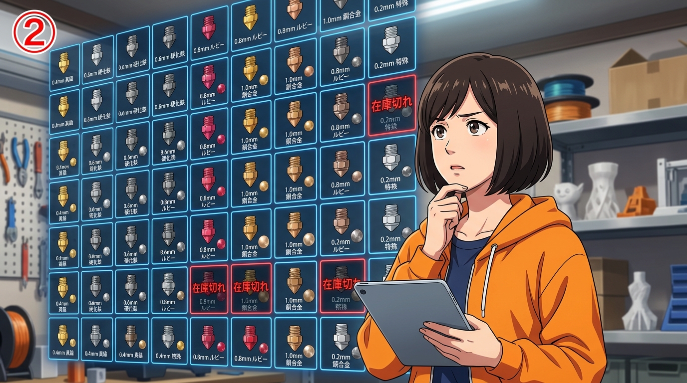 多くのユーザーが使うのは0.4mm口径のノズル。特に硬化鋼タイプはアップグレード需要も重なって人気が高い。PLAもPETGもTPUもこれ1本でいける。だからみんなこれを買う。で、真っ先に売り切れる。