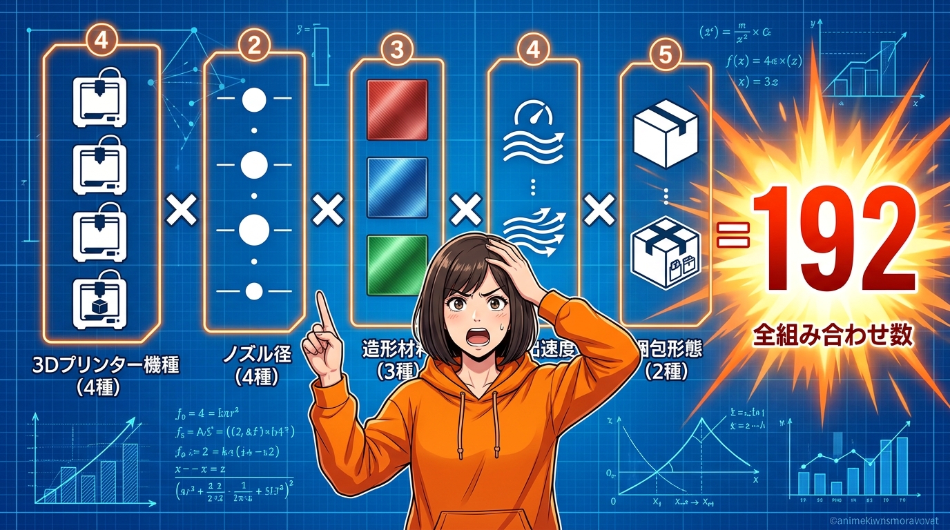 ホットエンド関連の部品だけで考えてみてください。まず「シリーズ」の違いで4系統。次に「ノズル口径」で0.2mm、0.4mm、0.6mm、0.8mmの4種類。「材質」でステンレス、硬化鋼、タングステンカーバイドの3種類。