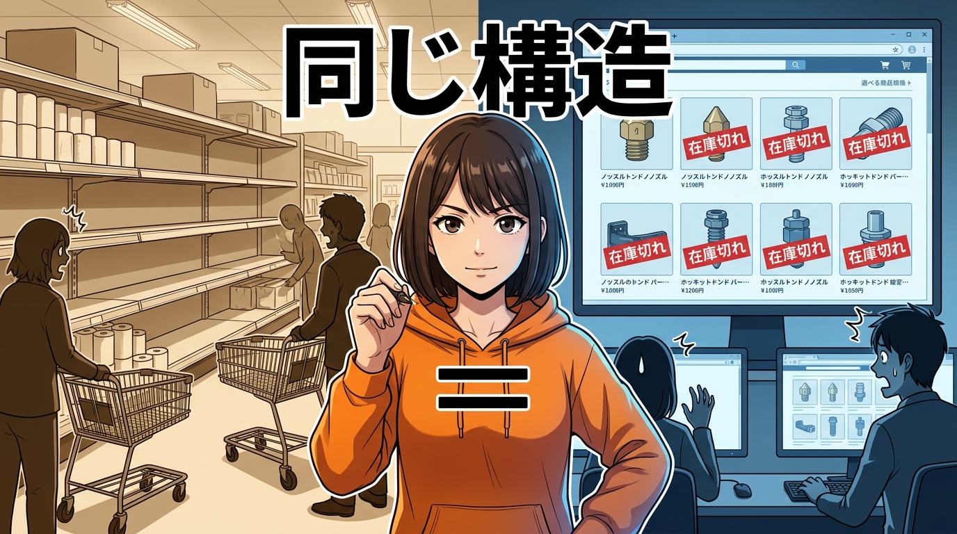 前編では、「何が起きているのか」という実態をお伝えしました。世界規模で部品が消えている、バックオーダーができない、特にホットエンドとシリコンソックが深刻。そういう現場の生々しい状況でしたよね。