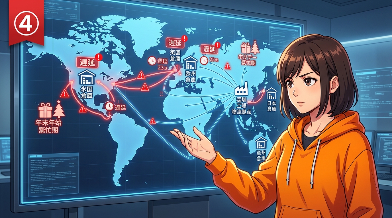 でもどこか一箇所でもトラブルが起きると、あっという間にバッファが底をつく。中国の工場で生産が遅れた、コンテナ船のスケジュールが乱れた、通関で想定以上の時間がかかった。どれか一つでもズレるだけで、倉庫の在庫が枯渇する。