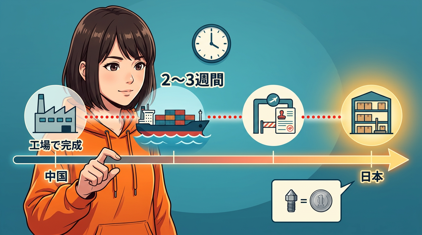部品って、単価が安くて体積も小さいものが多い。ノズル1個数百円、シリコンソック1枚数百円。こういうものを航空便で個別に送ったら、輸送コストの方が部品代より高くなってしまう。だから一般的には、こうした小物部品はコンテナ船などでまとめて輸送されることが多いと考えられます。