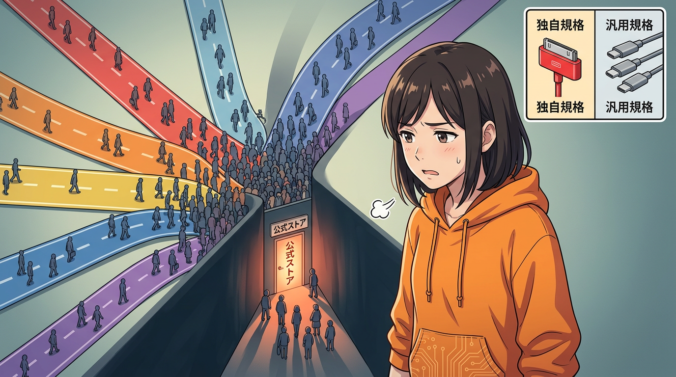 iPhoneの充電ケーブルがLightningだった時代を思い出してください。壊れても百均のケーブルが使えなかった、あの不便さです。USB-Cに統一される前は、Apple純正かMFi認証品を買うしかなかった。それと同じ構造がBambuの部品にも当てはまる。