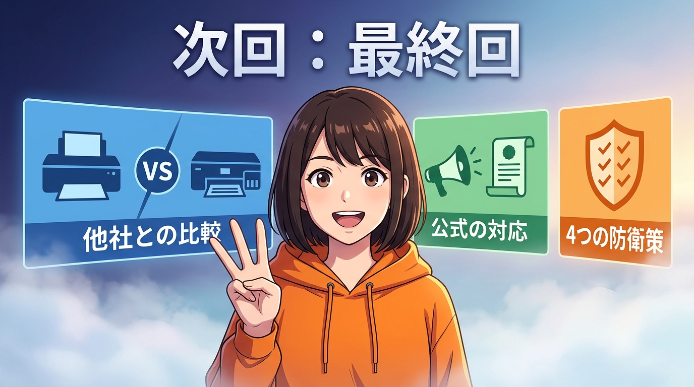 そして最後に、僕たちユーザーが「今すぐできる4つの防衛策」を具体的にお伝えします。部品が手に入らない時にどうやってプリンターを守るか、実践的なアドバイスです。