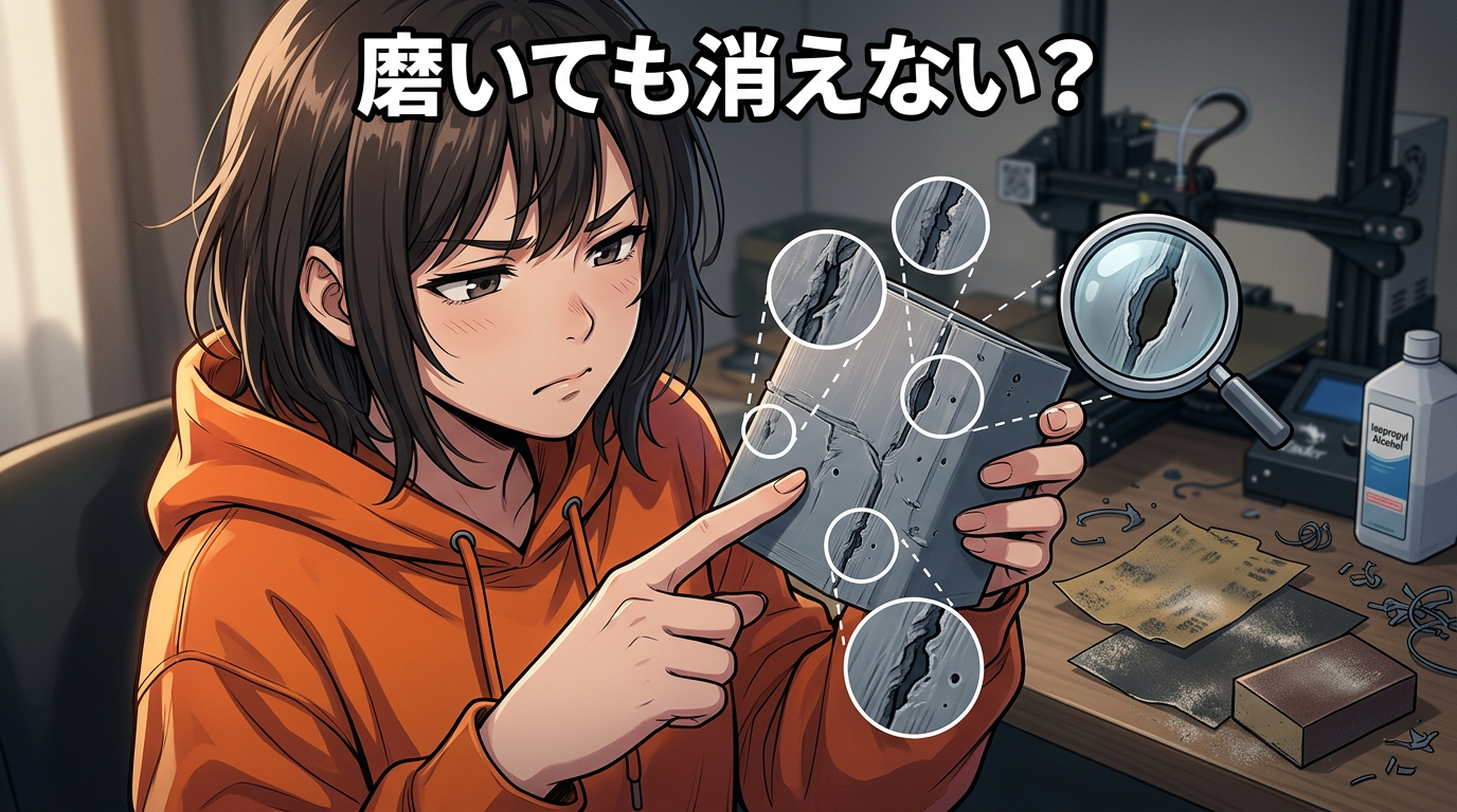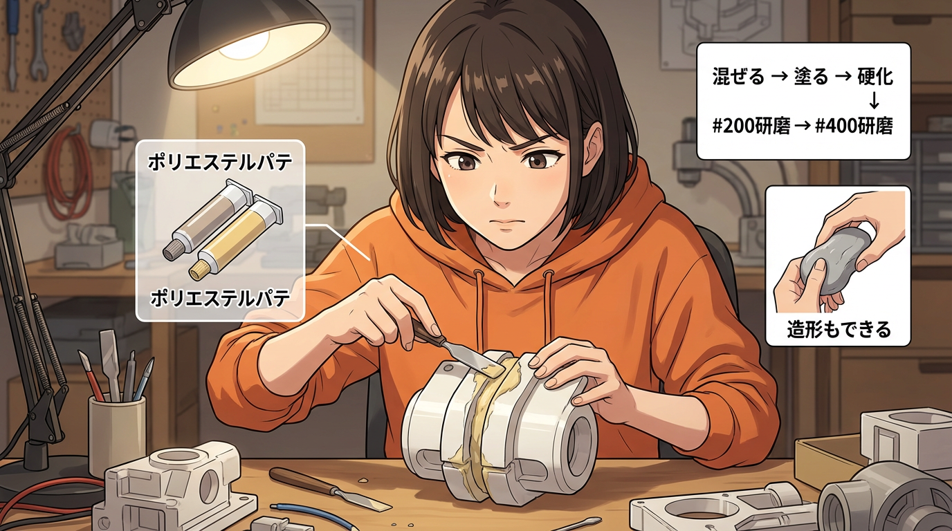 ヤスリをかけても消えない凹みってありますよね。特に分割印刷の接合部とか、サポート跡が深く食い込んだ場所とか。あれ、どれだけ番手を上げても平らにはならないんですよ。物理的にそこに「穴」が空いているから。磨くだけでは限界がある。