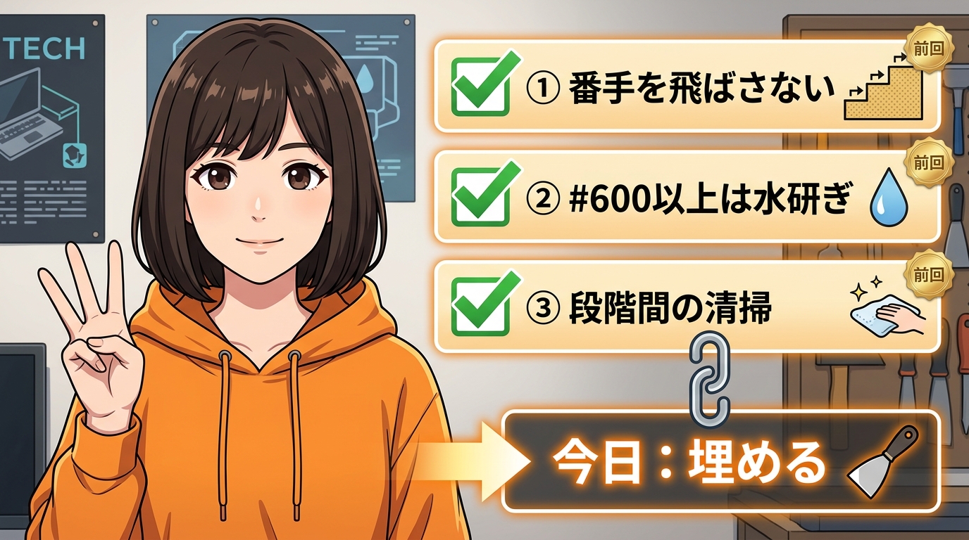 この3つがサンディングの基本で、今日の「埋める」工程はその土台の上に乗っかる作業です。
