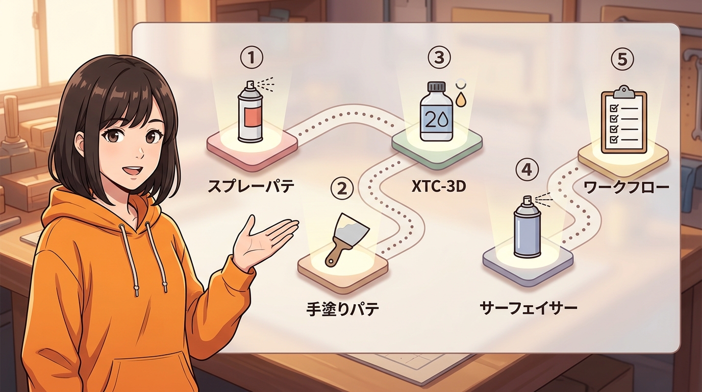 > ヤスリだけでは消せない凹みや隙間、パテを使えばかなり滑らかに仕上げられます。スプレーパテ・手塗りパテ・XTC-3Dの使い分けから、サーフェイサーの重要性、推奨ワークフロー6ステップまで徹底解説。