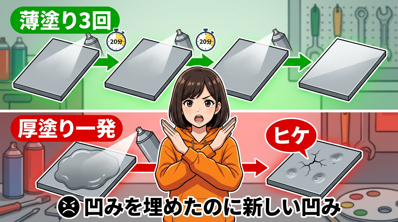 スプレーパテで一番やってはいけないのが、厚塗り一発です。「一回で厚く塗って終わらせよう」と思いがちなんですけど、これをやると乾燥時に溶剤が抜けて収縮して、「ヒケ」という凹みができてしまうんですよね。凹みを埋めるために塗ったのに新しい凹みができる。完全に本末転倒です。