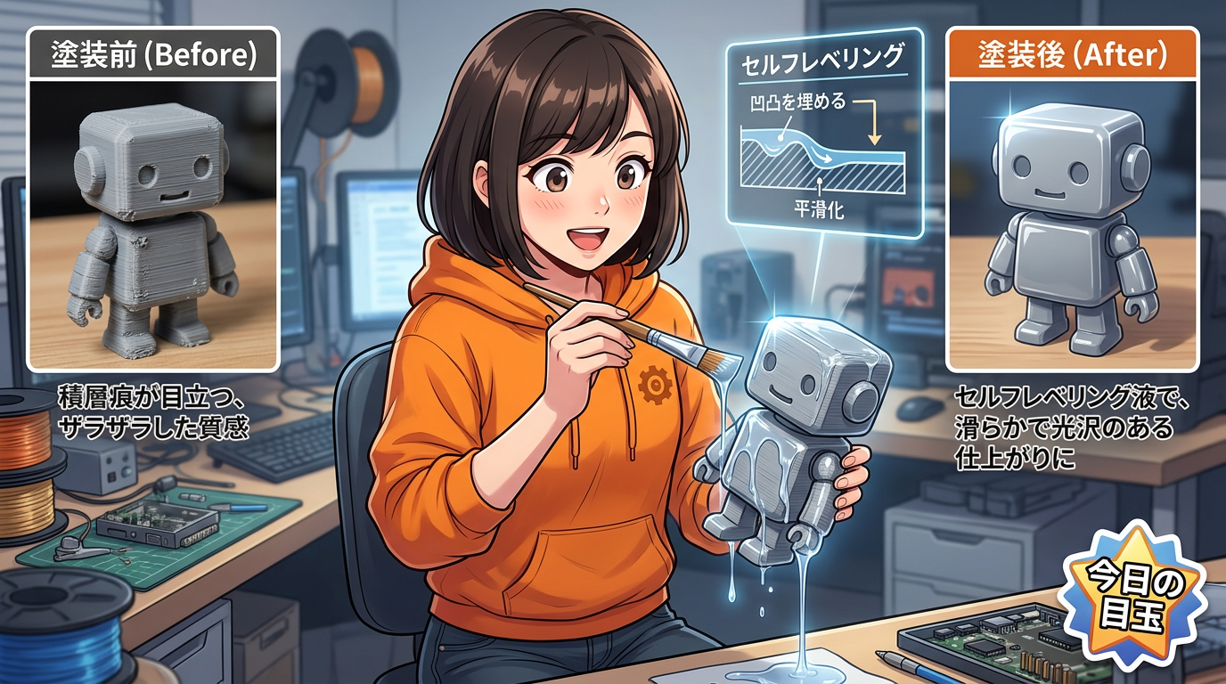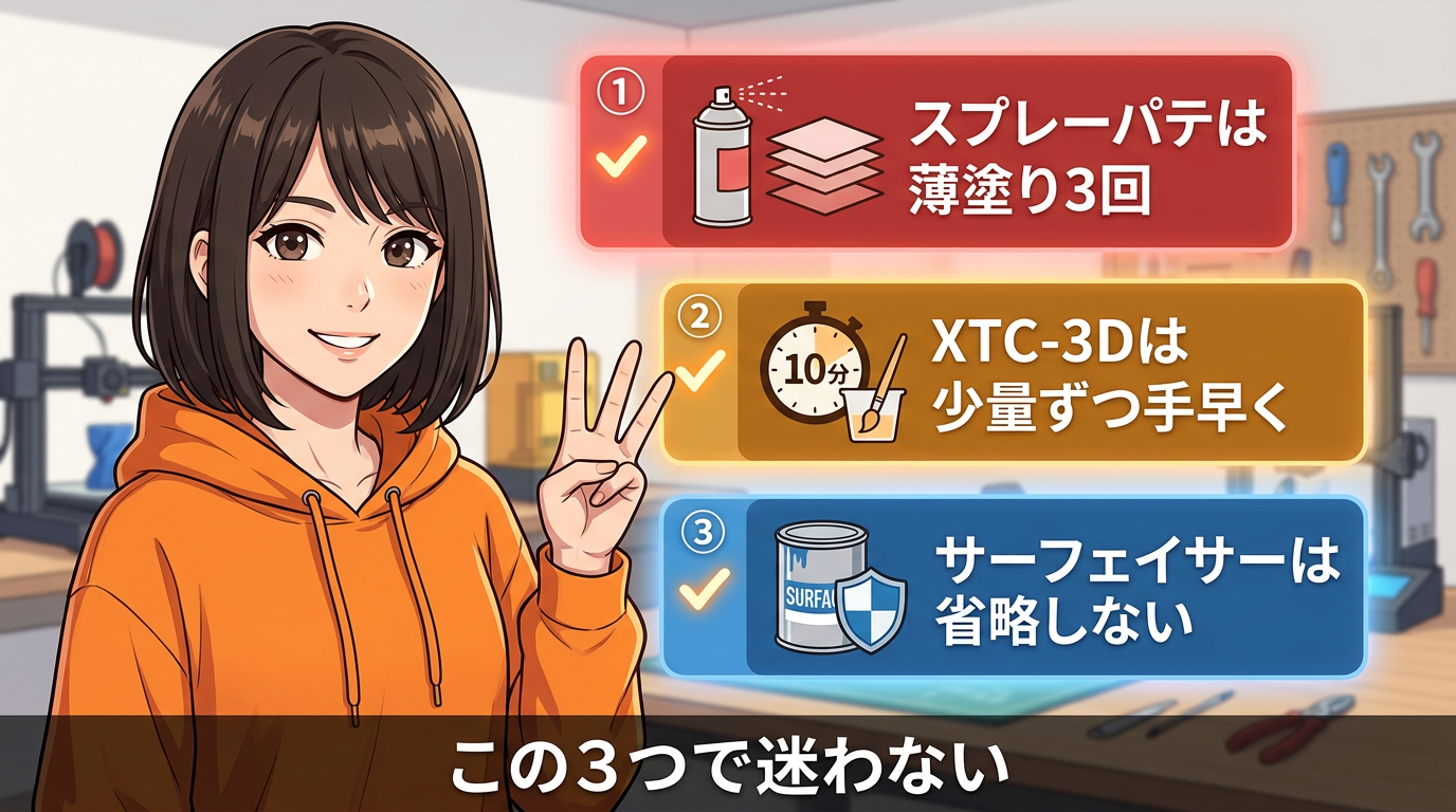 このシリーズで「磨く」を先にしたのは「技術の学習順」だからなんですよね。3Dプリント品の場合、積層痕の大部分はサンディングだけでかなり消せます。だからまず「ヤスリだけでどこまでいけるか」を知ってもらって、それでも消えない深い凹みだけをパテで埋める、という判断ができるようになってほしかった。いきなりパテから入ると、本来ヤスリだけで済む場所にまでパテを盛ってしまって、かえって手間が増えるんです。