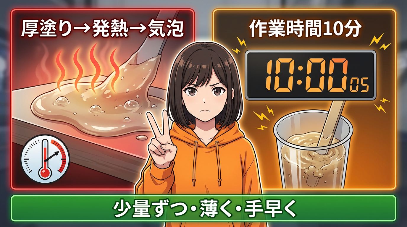 まず厚塗りはNG。公式でも各層は薄く、1/64インチ未満が推奨されています。厚く塗ると硬化時の発熱で気泡ができて、塗る前より表面が荒れるという最悪の結果になりかねない。