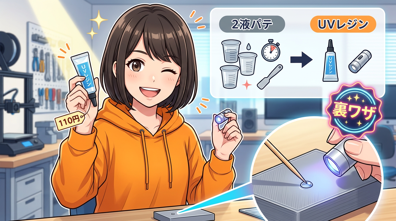 使い方は簡単で、UVレジンを爪楊枝で少量詰めて、UV LEDライトを当てれば硬化完了。ライトの種類と厚みによりますが、数十秒から数分で固まります。あとは軽くサンディングするだけ。ただし広い面や厚盛りには向かないので、あくまでピンポイント補修向きと覚えておいてください。110円で試せるので、ぜひ一度使ってみてください。