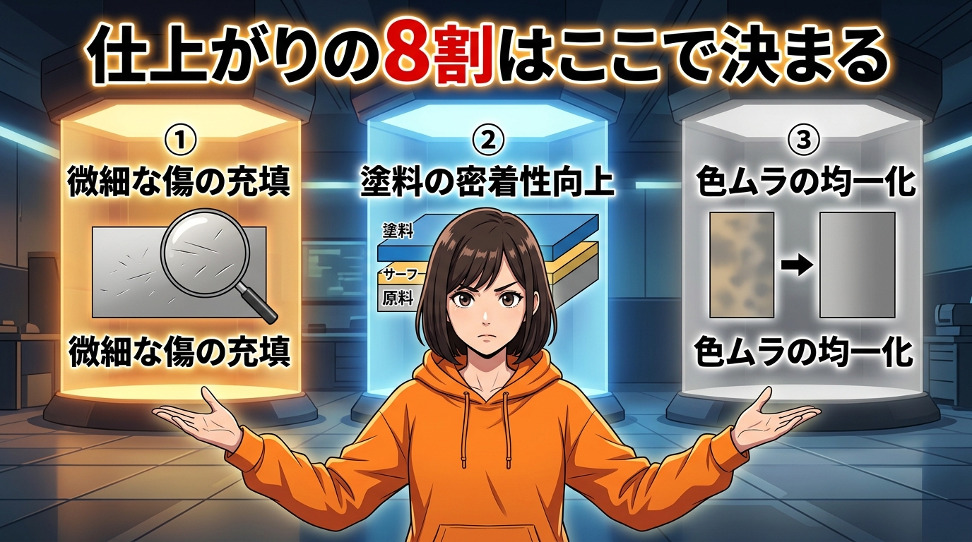 サーフェイサーには3つの役割があります。
