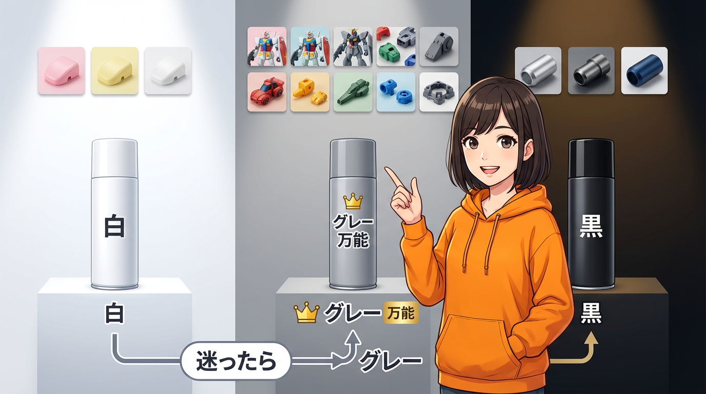 色の選び方にもコツがあって、仕上げが白や明るい色なら白サーフェイサー。暗い色ならグレー。メタリック系なら黒が有力です。迷ったらグレーが万能。最初の1本なら間違いなくグレーをおすすめします。