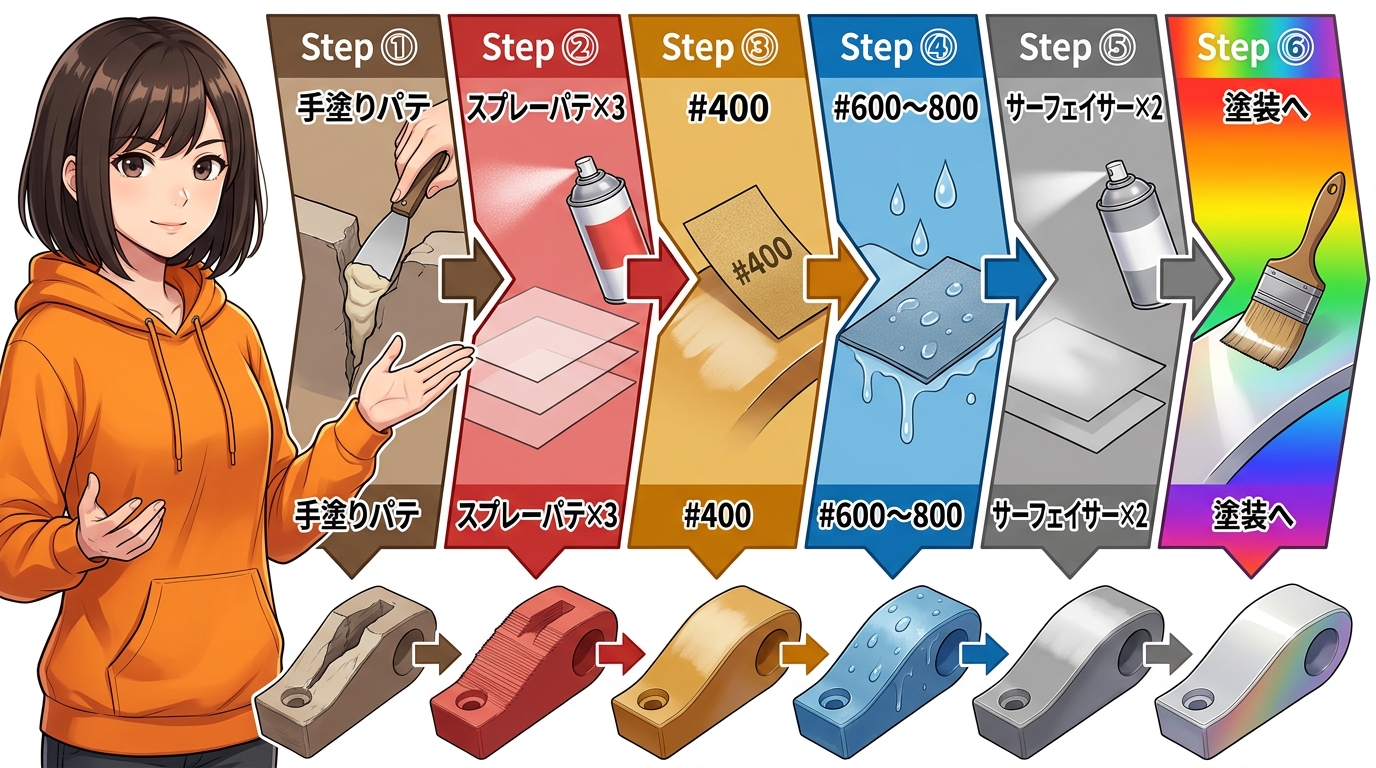 毎回全部やる必要はなくて、状況に応じて省略できます。浅い凹みだけなら①を飛ばしていいし、XTC-3Dを使うと中間工程を減らせることもあります。パーツの状態を見て柔軟に判断してください。