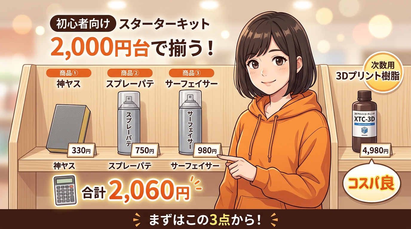 神ヤス504円、ホルツのスプレーパテ1,100円、サーフェイサーは数百円から千円前後。この基本3点セットで合計2,000円台前半くらいです。