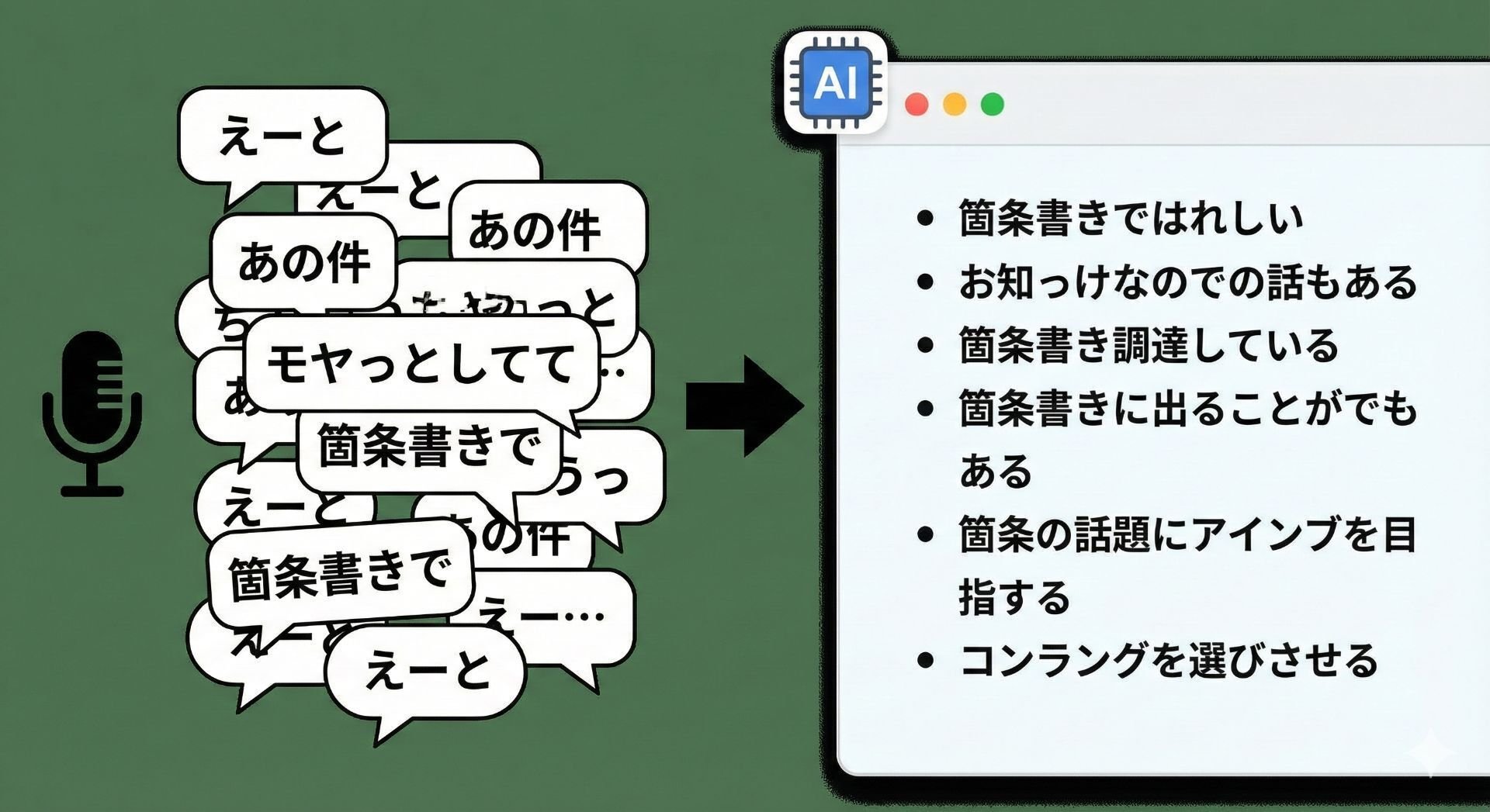 こんな独り言みたいな状態でも、そのまま投げて「要約して」と頼むだけ。驚くほど綺麗に整理してくれます。