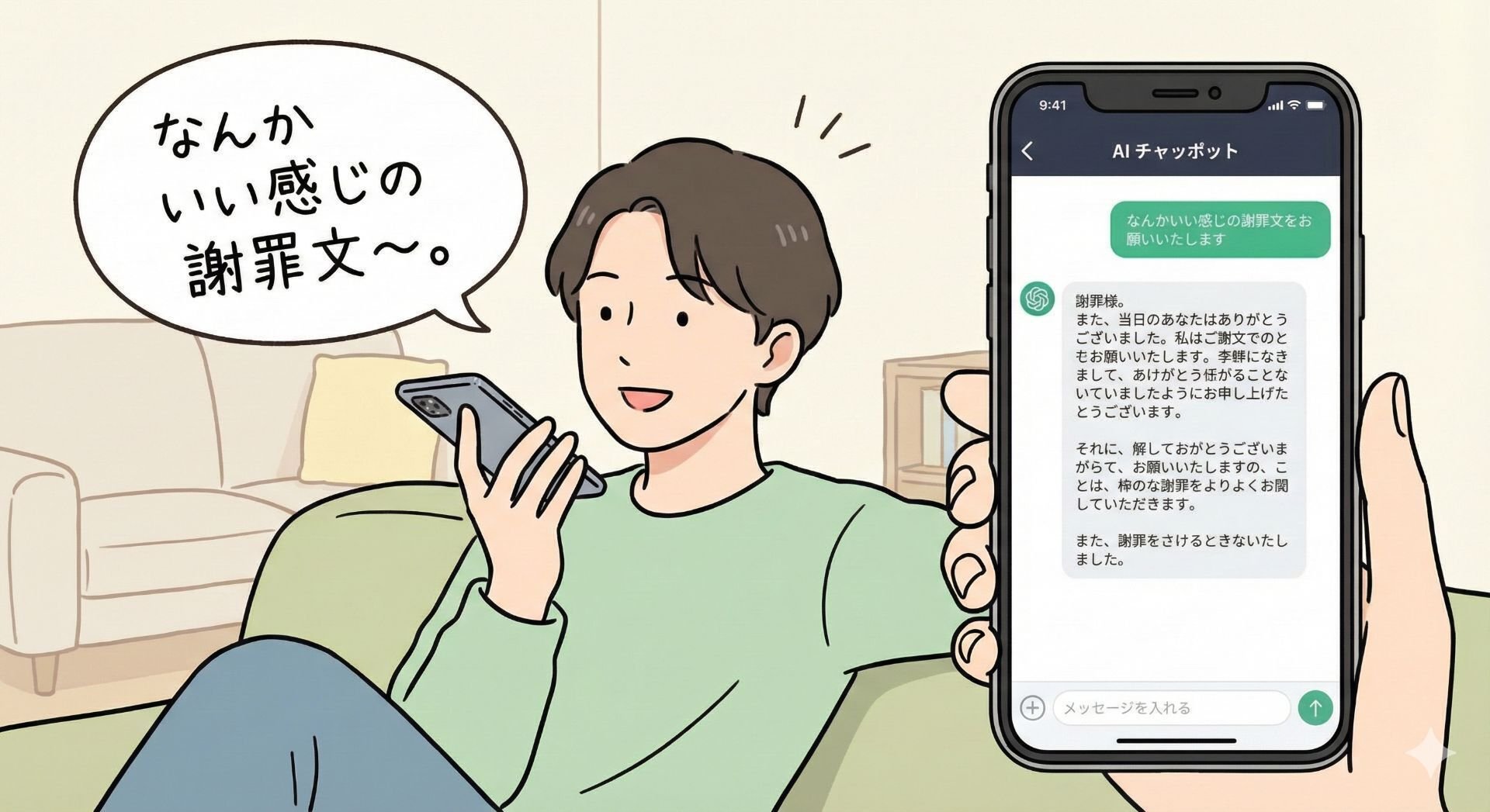 今のAIは本当に賢いです。「なんかこう、いい感じの謝罪文を考えてほしいんだけど…」みたいに、同僚に相談するような雑な聞き方でも、ちゃんと意図をくみ取ってくれます。
